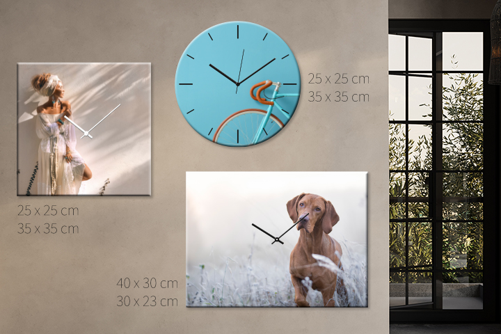 Für personalisierte Wanduhren stehen verschiedene Formate zur Auswahl. Du kannst zwischen Querformat 30x23 cm, 40x30 cm, Quadratisch in der Größe 25x25 cm und 35x35 cm, sowie Rund 25x25 cm und 35x35 cm wählen. Individuelle Maße sind auf Anfrage ebenfalls möglich. Wählen Sie das Format, das am besten zu Ihrem persönlichen Stil und Ihrer Einrichtung passt!