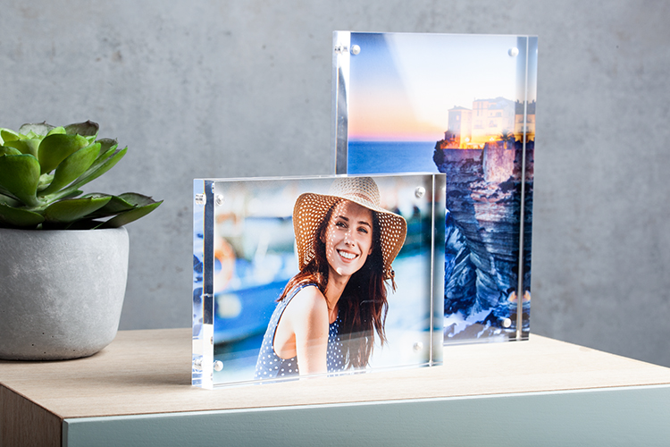 Die Fotoaufsteller von PixelfotoExpress sind eine moderne Alternative zu herkömmlichen Bilderrahmen. Verschönern Sie Ihre Umgebung mit Bildern auf Alu-Dibond, Butlerfinish oder hinter Acryl inkl. verchromter Standfüße. Der 17 mm starke Acrylblock passt sich lässig jedem Möbelstück an und ist in drei verschiedenen Größen erhältlich.