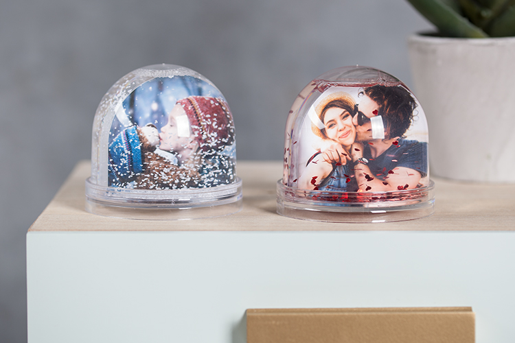 Gestalten Sie Ihre Fotokugel mit eigenen Fotos direkt online und erfreuen Sie sich und andere mit weißen magischen Schneeflocken oder Herzglitzer.
