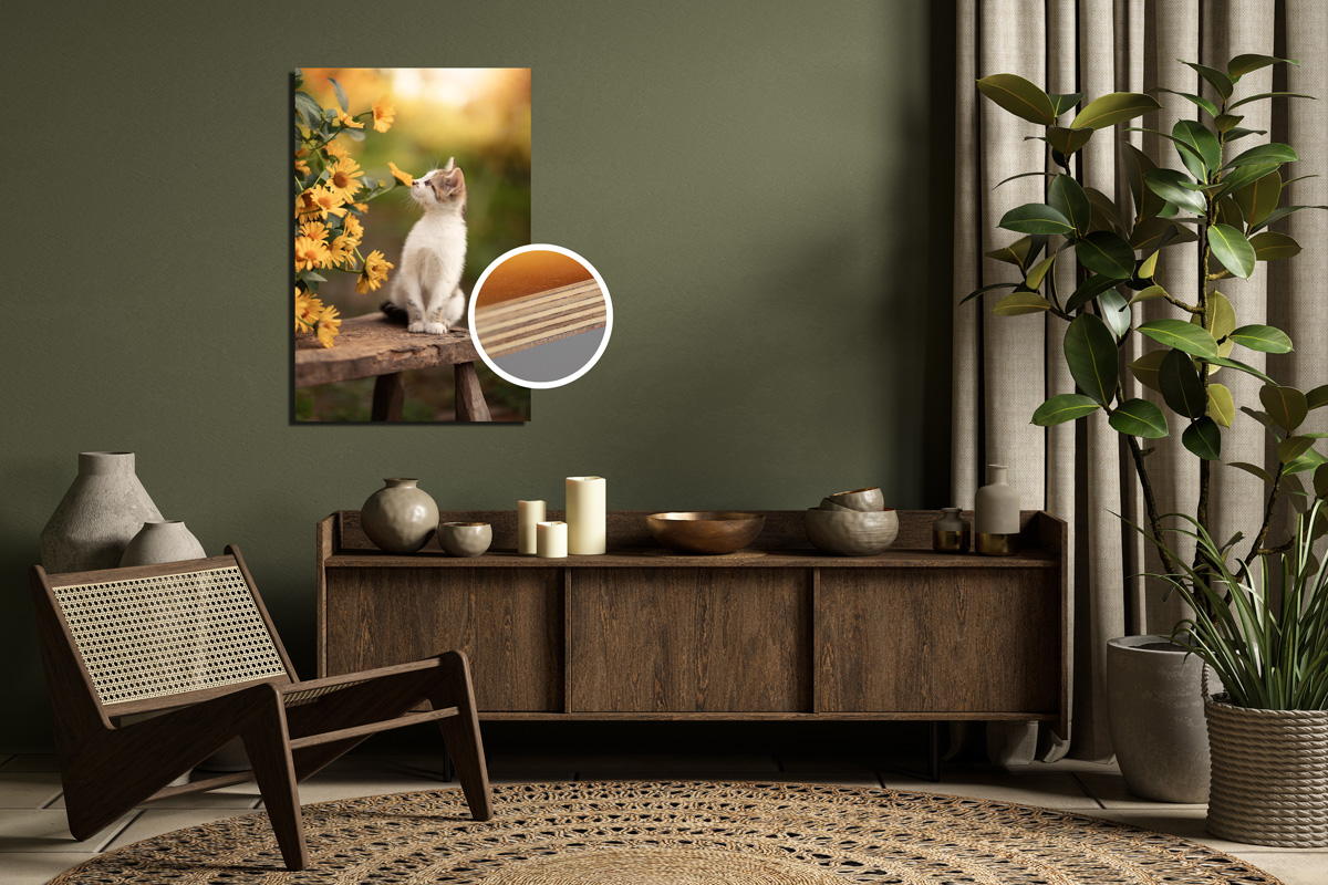 Gestalten Sie Ihr Motiv direkt auf einer 12 mm starken Holzplatte. Der moderne UV-Direktdruck lässt die natürliche Maserung des Holzes sichtbar und verleiht Ihren Fotos eine harmonische, lebendige Struktur. So entstehen Wandbilder, die nicht nur Ihre Motive authentisch präsentieren, sondern auch ein warmes, gemütliches und natürliches Wohnambiente schaffen.